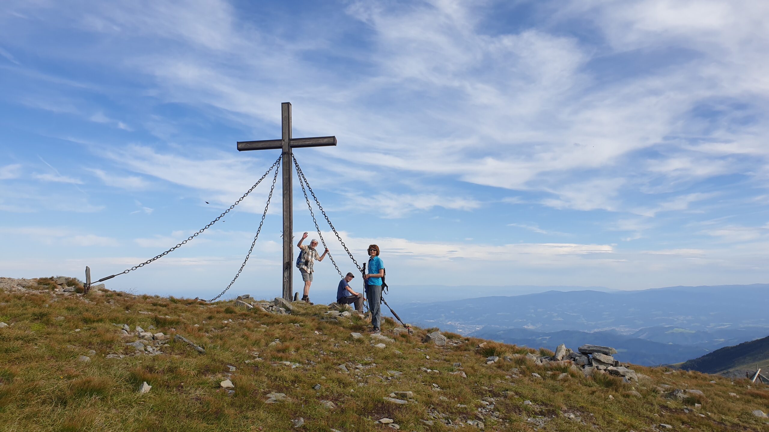 Der Lenzmoarkogel? Ich wage nicht, das noch vorzuschlagen, aber Hans sagt: „Sieht sehr nahe aus! Da gehen wir doch noch rüber!“ Worte wie Dopamin!  Auch die Schwüle des Tages hatten wir im Tal gelassen, und ein frisches Lüfterl hat uns zusätzlich beflügelt. Nach gestoppten 17 Minuten waren wir am Ziel der Tour! Abklatschen, Gipfelfotos, Rundherum-Blick mit fröhlichem Bergeraten (Man sieht tatsächlich die Koschuta!!!), Segenswünsche und Jausenpause.